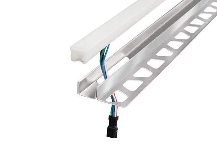 Schlüter-LIPROTEC-LLPM sind steckfertige LED-Module aus einem flexiblen, voll ummantelten LED-Schlauch mit homogener Lichtstreuung und einem Aufnahmeprofil aus Aluminium oder Edelstahl mit trapezgelochtem Befestigungsschenkel. Die LED-Module sind wahlweise mit fixen Farbtemperaturen von 3000 K oder 4900 K im Weißlichtbereich oder im farbigen Lichtbereich RGB+W erhältlich. Letztere ermöglichen das Einstellen von mehr als 16 Millionen unterschiedlichen Farbtönen und Farbtemperaturen von 2500 K – 6500 K. Das weiße LED-Modul ist in der Bauhöhe 11 mm erhältlich und erlaubt so einen flächenbündigen Einbau in Fliesendicke.